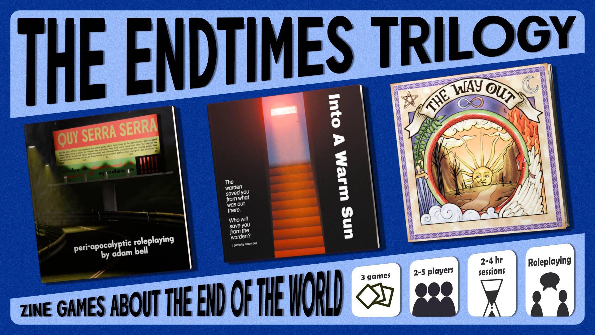 Adam Bell Games Newsletter Back The Endtimes Trilogy now! Brace Yourself for the Endtimes The Endtimes Trilogy is now live on Backerkit! These three games are great for any fans of indie RPGs. You've got prompt-driven madness in Quy Serra Serra, where four unscrupulous characters go about their lives as the world ends around them. You've got tense dice rolls in Into A Warm Sun, where the GM has total control over a bunker at the end of the world à la 10 Cloverfield Lane. And you have...